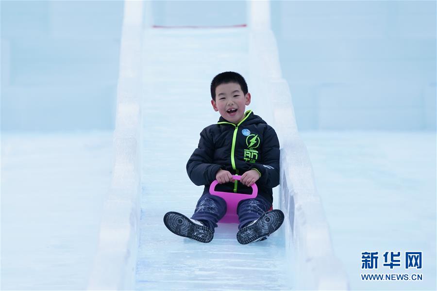 12月26日,一位小朋友在“鸟巢”内的冰滑梯上体验滑冰乐趣。 当日,第二届“相约2022”冰雪文化节在北京奥林匹克中心区开幕,活动将持续到2020年2月8日。据悉,本届冰雪文化节秉持“让奥林匹克点亮青年梦想,让冬季运动融入亿万民众,让奥运盛会惠及发展进步,让世界更加相知相融”的愿景,联动双奥场馆“鸟巢”“水立方”及庆典广场,通过文化推广、科技展示、冰雪体验、公益活动等方式,将中国文化、冬季体育和奥林匹克精神有机结合,打造独具冬奥特色、全民参与的冰雪主题文化活动平台,为2022年北京冬奥会预热。 新华社记者 鞠焕宗 摄