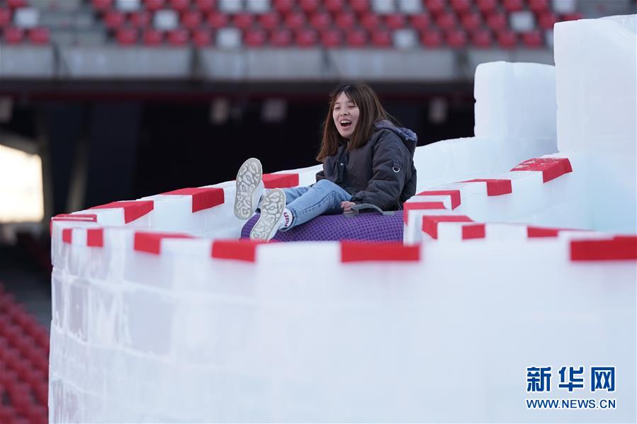 12月26日,一位游客在“鸟巢”内的冰滑梯上体验滑冰乐趣。 当日,第二届“相约2022”冰雪文化节在北京奥林匹克中心区开幕,活动将持续到2020年2月8日。据悉,本届冰雪文化节秉持“让奥林匹克点亮青年梦想,让冬季运动融入亿万民众,让奥运盛会惠及发展进步,让世界更加相知相融”的愿景,联动双奥场馆“鸟巢”“水立方”及庆典广场,通过文化推广、科技展示、冰雪体验、公益活动等方式,将中国文化、冬季体育和奥林匹克精神有机结合,打造独具冬奥特色、全民参与的冰雪主题文化活动平台,为2022年北京冬奥会预热。 新华社记者 鞠焕宗 摄