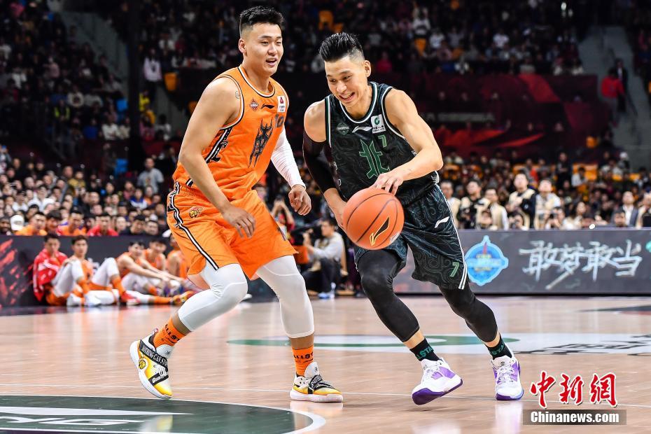 1月12日晚,“2019-2020赛季CBA全明星周末”在广州继续进行。在一对一单挑赛上,林书豪与赵睿战成9比9,握手言和。图为北区明星队球员林书豪(右)在比赛中突破南区明星队球员赵睿的防守。中新社记者 陈骥旻 摄
