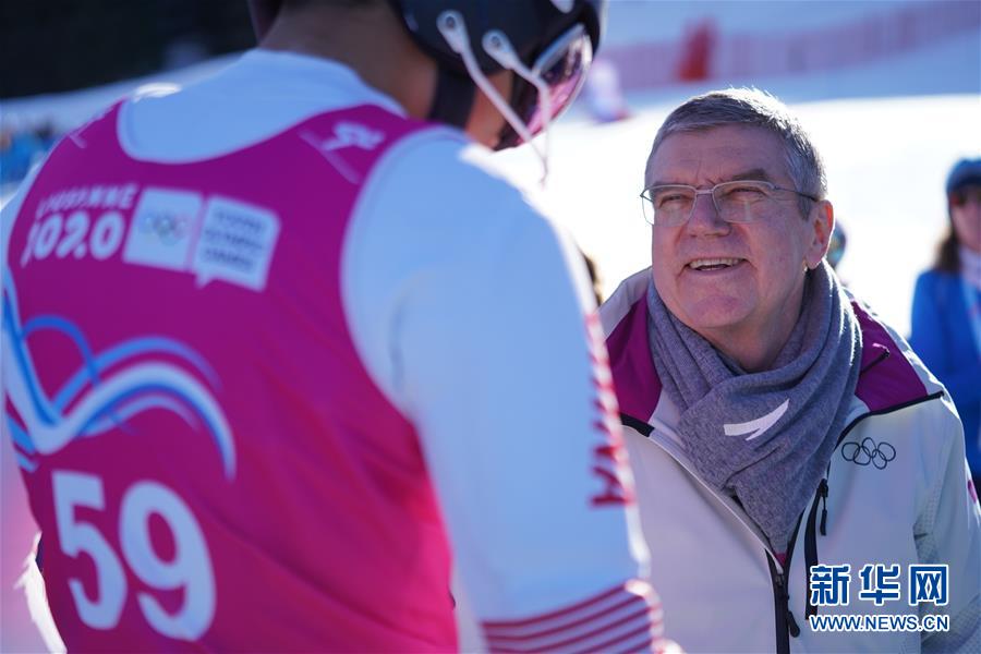 1月14日,国际奥委会主席巴赫(右)和中国选手易骁飏在比赛后交谈。 当日,第三届冬季青年奥林匹克运动会高山滑雪男子回转比赛在瑞士莱迪亚布勒雷高山滑雪中心进行。 新华社发(卢星吉摄)