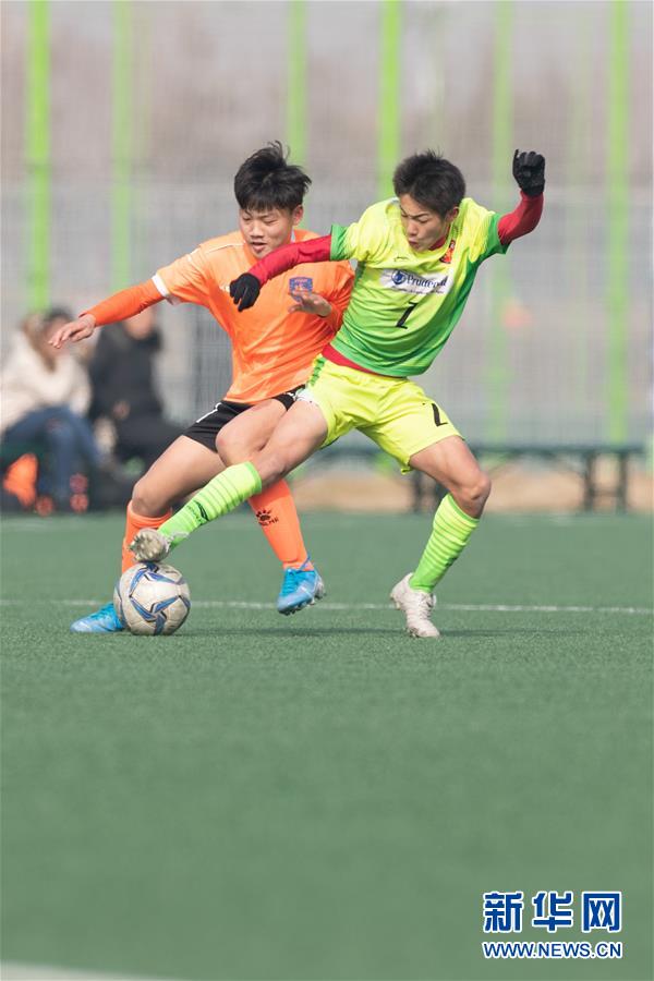 1月19日,日本大阪生野FC队球员小柳力爱(右)在比赛中拼抢。 当日,在青岛城阳举办的阳光杯中日韩青少年足球邀请赛初中组决赛中,日本大阪生野FC队以3比0战胜中国青岛中能U15队,获得冠军。 新华社记者孟鼎博摄