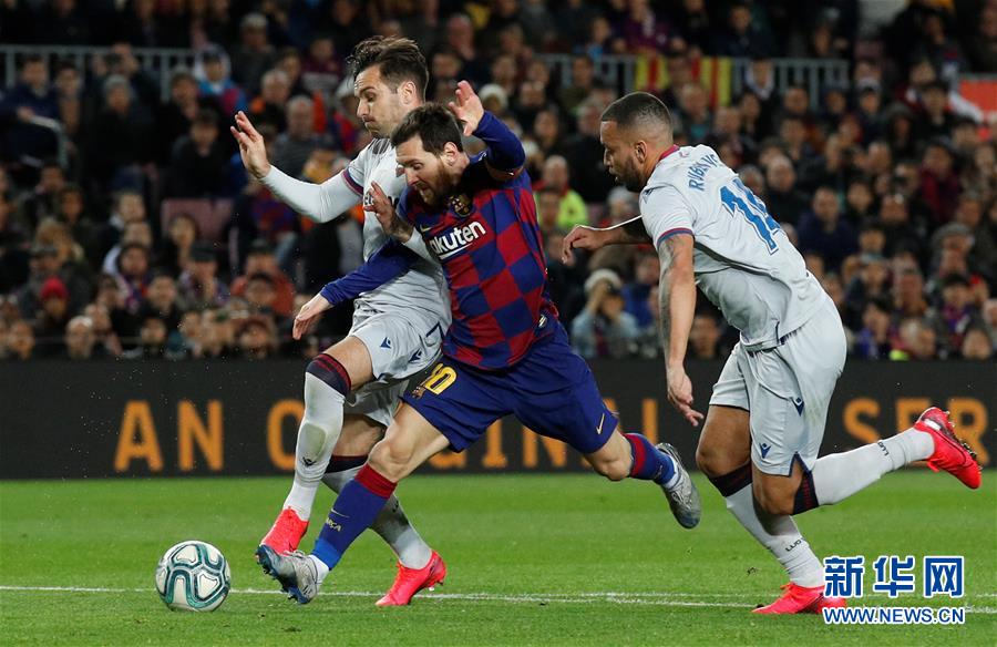 2月2日,巴塞罗那队球员梅西(中)和莱万特队球员韦佐(右)、托尼奥拼抢。 当日,在2019-2020赛季西甲联赛第22轮比赛中,巴塞罗那队主场以2比1战胜莱万特队。 新华社/路透