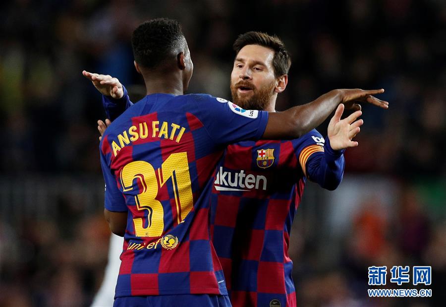 2月2日,巴塞罗那队球员法蒂(左)在打入第一粒进球后和队友梅西庆祝。 当日,在2019-2020赛季西甲联赛第22轮比赛中,巴塞罗那队主场以2比1战胜莱万特队。 新华社/路透
