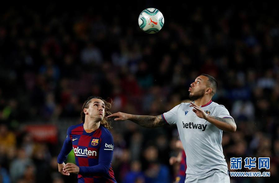 2月2日,巴塞罗那队球员格列兹曼(左)和莱万特队球员韦佐拼抢。 当日,在2019-2020赛季西甲联赛第22轮比赛中,巴塞罗那队主场以2比1战胜莱万特队。 新华社/路透