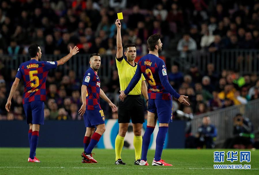2月2日,巴塞罗那队球员皮克(右一)被主裁判出示黄牌。 当日,在2019-2020赛季西甲联赛第22轮比赛中,巴塞罗那队主场以2比1战胜莱万特队。 新华社/路透