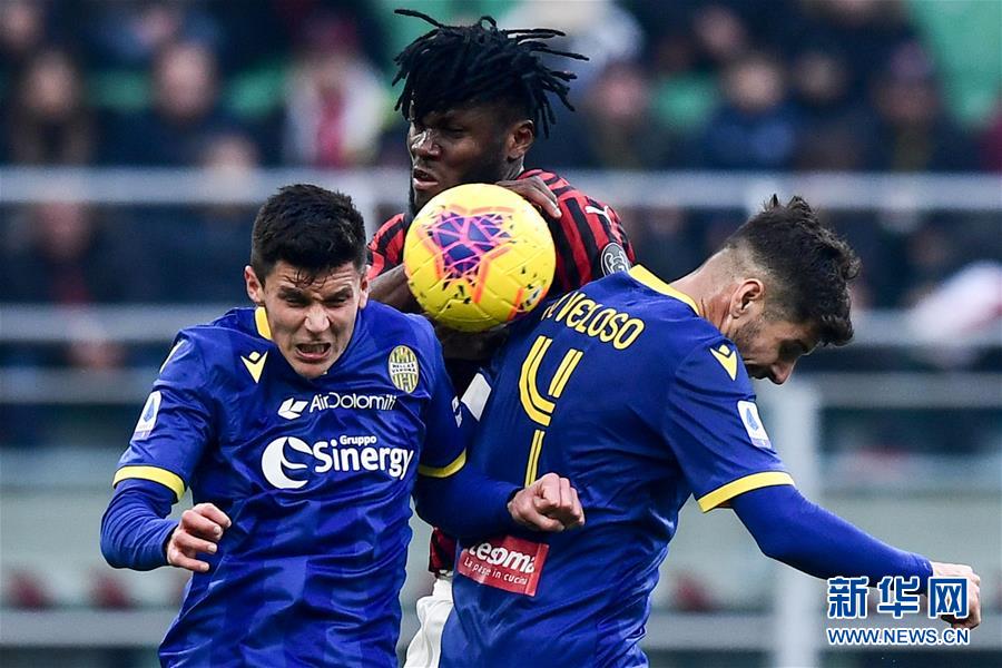 2月2日,AC米兰队球员凯西(中)和维罗纳队球员佩西纳(左)、贝洛索争顶。 当日,在2019-2020赛季意大利足球甲级联赛第22轮比赛中,AC米兰队主场以1比1战平维罗纳队。 新华社/法新