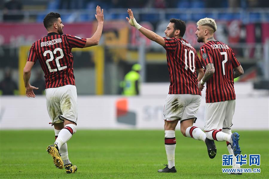 2月2日,AC米兰队球员恰尔汗奥卢(中)在进球后和队友穆萨基奥(左)、卡斯蒂列霍庆祝。 当日,在2019-2020赛季意大利足球甲级联赛第22轮比赛中,AC米兰队主场以1比1战平维罗纳队。 新华社/法新