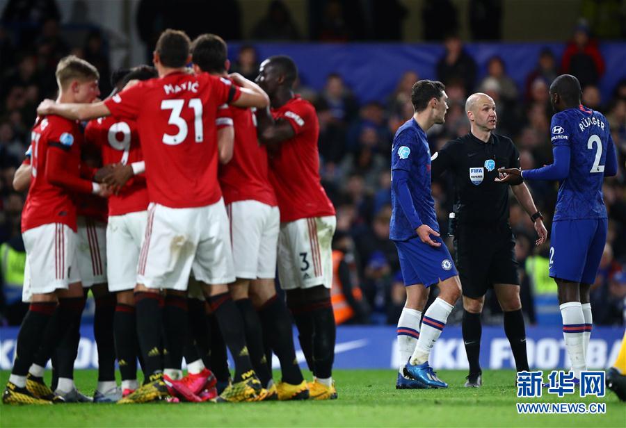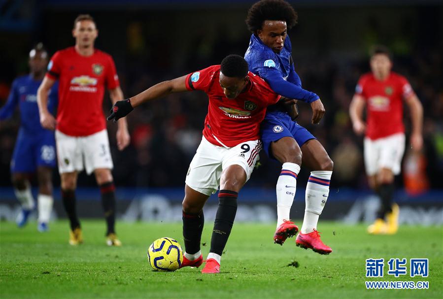 2月17日,曼联队球员马夏尔(左)和切尔西队球员威廉拼抢。 当日,在2019-2020赛季英格兰足球超级联赛第26轮比赛中,曼彻斯特联队客场以2比0战胜切尔西队。 新华社/路透