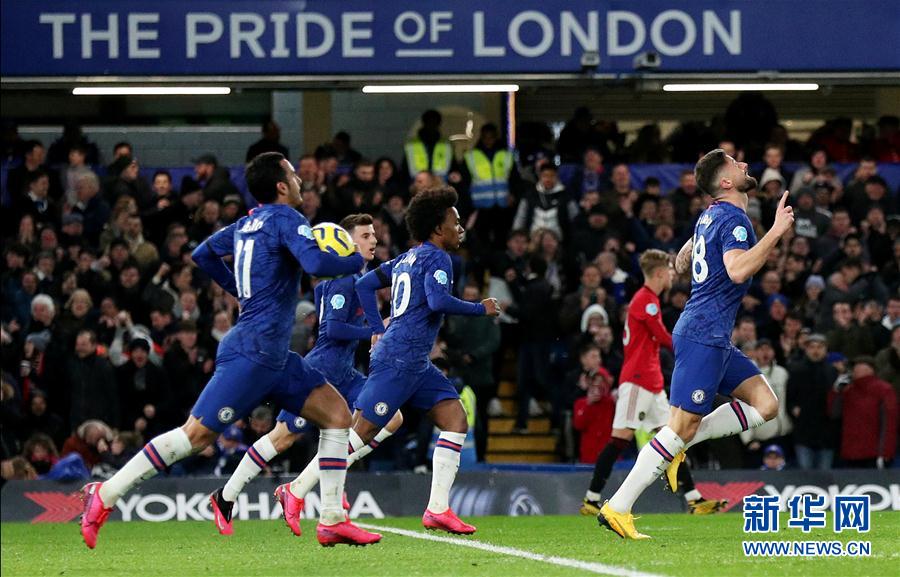 2月17日,切尔西队球员吉鲁(右一)在进球后庆祝。随后这个进球因越位被判无效。 当日,在2019-2020赛季英格兰足球超级联赛第26轮比赛中,曼彻斯特联队客场以2比0战胜切尔西队。 新华社/路透