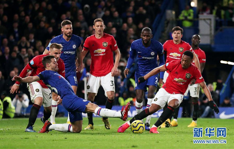 2月17日,曼联队球员马夏尔(前右)和切尔西队球员阿斯皮利奎塔(前左)拼抢。 当日,在2019-2020赛季英格兰足球超级联赛第26轮比赛中,曼彻斯特联队客场以2比0战胜切尔西队。 新华社/路透