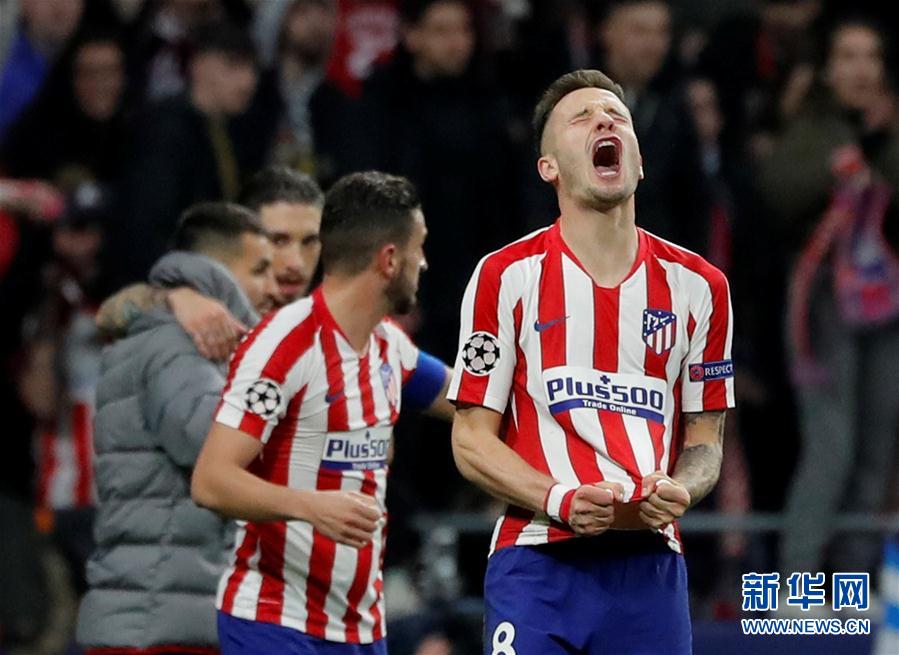2月18日,马德里竞技队球员萨乌尔(右)在赛后庆祝胜利。 当日,在西班牙马德里举行的2019-2020赛季欧冠联赛八分之一决赛首回合比赛中,西甲马德里竞技队主场以1比0战胜英超利物浦队。 新华社/路透