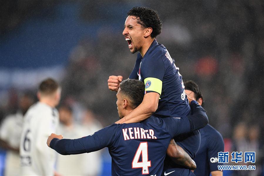 2月23日,巴黎圣日耳曼队球员马基尼奥斯(上)在比赛中庆祝进球。 当日,在2019-2020赛季法国足球甲级联赛第26轮比赛中,巴黎圣日耳曼队主场以4比3战胜波尔多队。 新华社发(杰克·陈摄)