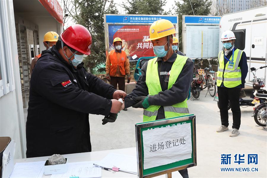 4月9日,在冬奥会非注册VIP接待中心工程现场,工人在进场前接受体温检测。 连日来,位于河北省张家口经济开发区长城西大街的冬奥会非注册VIP接待中心项目工程建设有序推进。据介绍,该项目预计今年6月底完成主体结构封顶,整体工程预计2021年10月底完工。 新华社发(武殿森 摄)