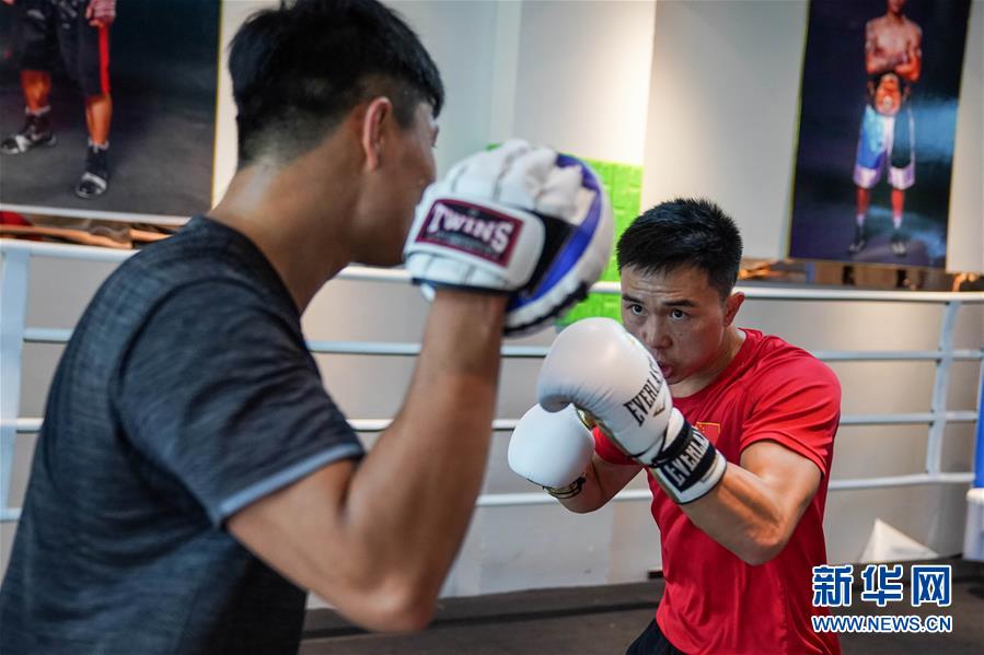 4月28日,徐灿(右)与教练任洪宝在训练中。 近日,虽然他与国际拳击联合会(IBF)羽量级拳王、英国名将沃灵顿的比赛受疫情影响被推迟,世界拳击协会(WBA)羽量级世界拳王徐灿仍在昆明坚持训练,保持良好的竞技状态。 新华社记者胡超摄