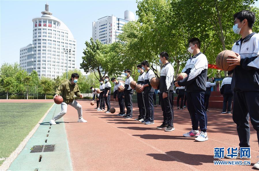 4月29日,山东省济南第九中学的老师(左一)在体育课上指导学生练习篮球运球。 山东省济南第九中学在积极防控疫情的基础上,为高三年级学生调整体育课教学内容,以快步走、太极拳、篮球运球、排球垫球等中、低强度的“舒缓”项目为主,达到提高学生身体素质的目标。 新华社记者 王凯 摄