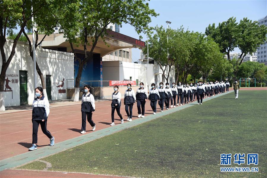 4月29日,山东省济南第九中学的学生在体育课上快步走。 山东省济南第九中学在积极防控疫情的基础上,为高三年级学生调整体育课教学内容,以快步走、太极拳、篮球运球、排球垫球等中、低强度的“舒缓”项目为主,达到提高学生身体素质的目标。 新华社记者 王凯 摄