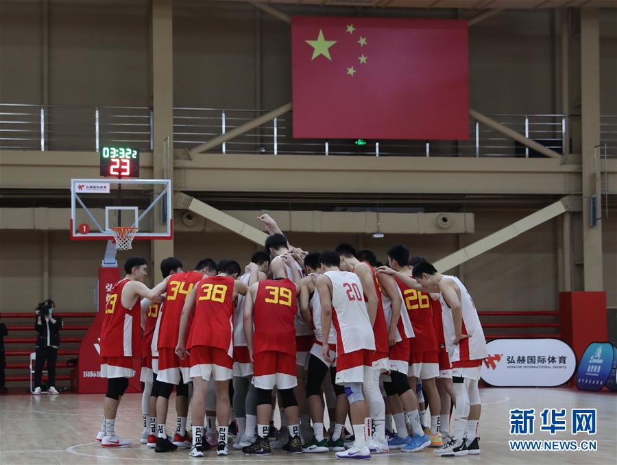 5月9日,双方球员在比赛开始前鼓劲。 当日,在北京封闭举行的中国青年男篮对抗赛中,国青U17队以70比54战胜国青U18队。 新华社记者孟永民摄