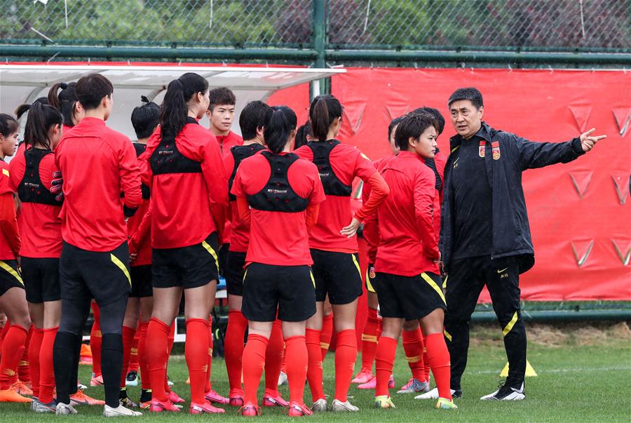 5月15日,中国女足主教练贾秀全(右一)在训练前向队员布置任务。 当日,中国国家女子足球队继续在苏州市太湖足球运动中心集训。 新华社记者杨磊摄