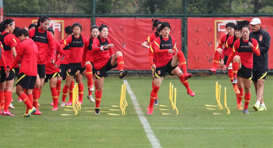 5月15日,中国女足队员在训练前热身。 当日,中国国家女子足球队继续在苏州市太湖足球运动中心集训。 新华社记者杨磊摄