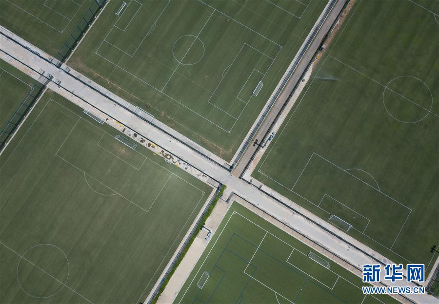 这是5月17日拍摄的海口观澜湖足球基地,部分室外足球场已经完工(无人机照片)。 据了解,海口观澜湖足球基地计划建设30片国际标准化足球训练场以及相关配套设施,目前,部分室外足球场已完工并投入使用,球员公寓、更衣室、室内足球馆等配套设施也正在加紧施工建设中。 新华社记者蒲晓旭摄