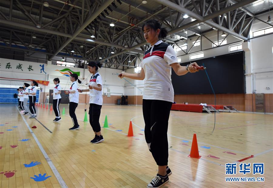 5月18日,合肥市第四十五中学森林城校区初三年级学生在体育课上练习跳绳。 近日,合肥市第四十五中学森林城校区在做好疫情防控的基础上,有序组织学生进行体育项目练习,为即将到来的体育中考做准备。 新华社发(周牧 摄)