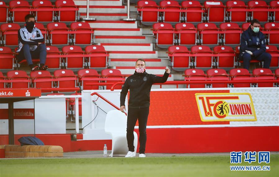 5月17日,拜仁慕尼黑队主教练弗利克戴口罩在场边指挥。 当日,在2019-2020赛季德甲联赛第26轮比赛中,拜仁慕尼黑队客场以2比0战胜柏林联合队。 新华社/路透