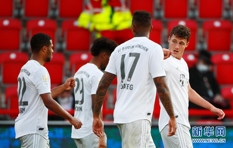 5月17日,拜仁慕尼黑队球员帕瓦尔(右一)在进球后和队友庆祝。 当日,在2019-2020赛季德甲联赛第26轮比赛中,拜仁慕尼黑队客场以2比0战胜柏林联合队。 新华社/路透