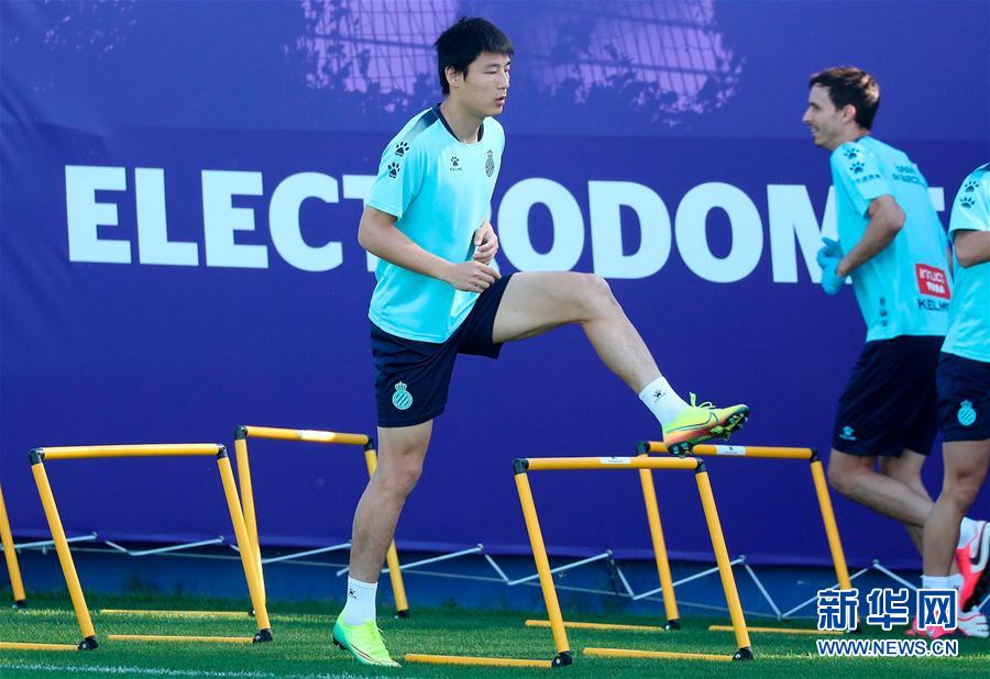 5月18日,西班牙人队球员武磊(左)与队友在训练中。 当日,西班牙多家足球俱乐部恢复训练,并将训练人数限制在十人以内。 新华社发(西班牙人队供图)