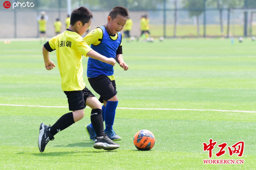 2020年5月24日,苏州,足球青训举办正酣。小球员们在周末来到球场进行训练,享受足球运动的乐趣。