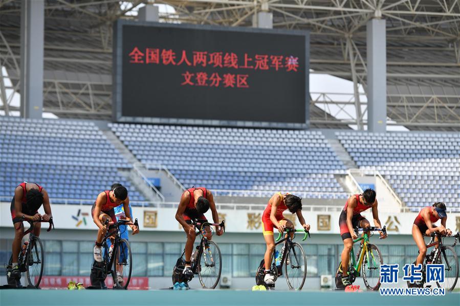 6月7日,运动员通过骑行平台在线比赛。 当日,全国铁人两项线上冠军赛在山东威海、河北承德、河南郑州三个赛区同时开赛。比赛通过“线上虚拟骑行+线下实景跑步”的互动形式,实现运动队、运动员之间的隔空对抗,开辟线上新赛场,通过比赛检验训练水平,激发训练热情。 新华社记者 朱峥 摄