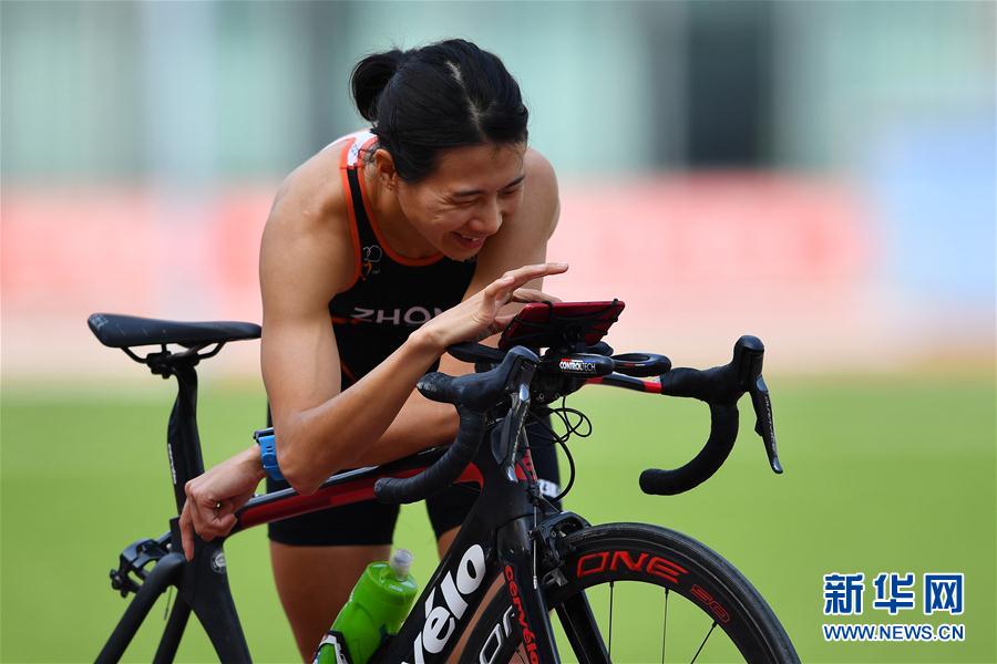 6月7日,山东选手仲梦颖在赛前调试在线骑行软件。最终她获得女子优秀组第一名。 当日,全国铁人两项线上冠军赛在山东威海、河北承德、河南郑州三个赛区同时开赛。比赛通过“线上虚拟骑行+线下实景跑步”的互动形式,实现运动队、运动员之间的隔空对抗,开辟线上新赛场,通过比赛检验训练水平,激发训练热情。 新华社记者 朱峥 摄