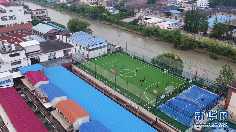 6月12日,市民在运动基地的屋顶上踢足球(无人机照片)。 位于上海市杨浦区军工路的一处运动基地是由一处老旧厂房改造而成。该运动基地对厂房的地面与屋顶空间加以综合利用,让周边市民在此体验足球、羽毛球、游泳等运动带来的快乐。 新华社记者 丁汀 摄