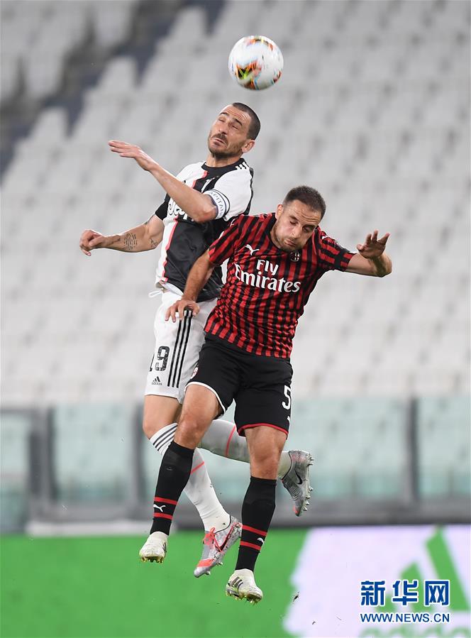 6月12日,尤文图斯队球员博努奇(左)与AC米兰队球员博纳文图拉争顶。 当日,在2019-2020赛季意大利杯半决赛第二回合的比赛中,尤文图斯队主场以0比0战平AC米兰队,双方总比分战成1比1。最终,尤文图斯队凭借客场进球优势晋级决赛。 受到新冠肺炎疫情影响,意大利政府在3月宣布暂停国内一切体育赛事,本场比赛是意大利三个多月以来的首场正式足球比赛。 新华社发