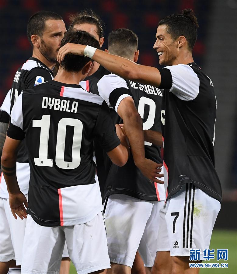 6月22日,尤文图斯队球员迪巴拉(10号)与队友在比赛中庆祝进球。 当日,在2019-2020赛季意甲第27轮比赛中,尤文图斯队客场以2比0战胜博洛尼亚队。 新华社发(阿尔贝托·林格利亚摄)