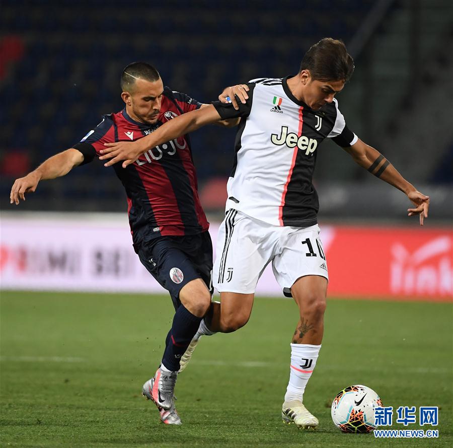 6月22日,尤文图斯队球员迪巴拉(右)与博洛尼亚队球员桑索在比赛中拼抢。 当日,在2019-2020赛季意甲第27轮比赛中,尤文图斯队客场以2比0战胜博洛尼亚队。 新华社发(阿尔贝托·林格利亚摄)
