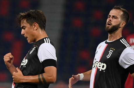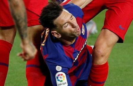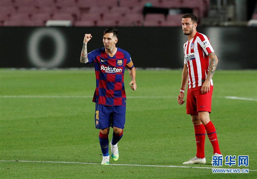 6月30日,巴塞罗那队球员梅西(左)在比赛中庆祝进球。 当日,在2019-2020赛季西班牙足球甲级联赛第33轮比赛中,巴塞罗那队主场以2比2战平马德里竞技队。 新华社/路透