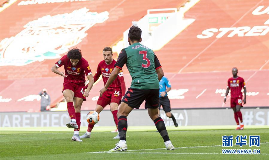 7月5日,利物浦队球员琼斯(左一)在比赛中射门得分。 当日,在2019-2020赛季英格兰足球超级联赛第33轮比赛中,利物浦队主场以2比0战胜阿斯顿维拉队。 新华社发