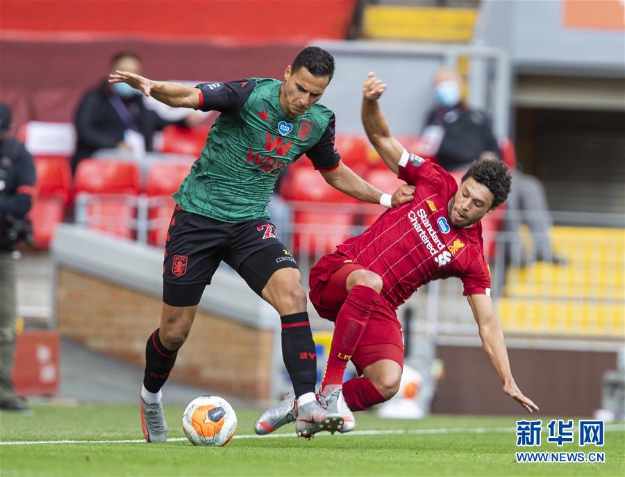 7月5日,利物浦队球员张伯伦(右)与阿斯顿维拉队球员埃尔-加齐拼抢。 当日,在2019-2020赛季英格兰足球超级联赛第33轮比赛中,利物浦队主场以2比0战胜阿斯顿维拉队。 新华社发