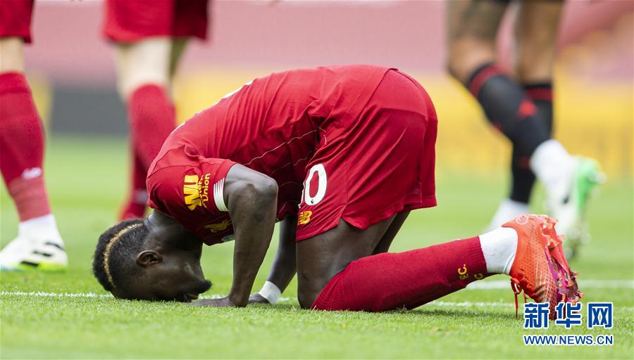 7月5日,利物浦队球员马内在进球后跪地庆祝。 当日,在2019-2020赛季英格兰足球超级联赛第33轮比赛中,利物浦队主场以2比0战胜阿斯顿维拉队。 新华社发