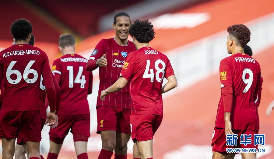 7月5日,利物浦队球员琼斯(右二)在进球后与队友范迪克(右三)庆祝。 当日,在2019-2020赛季英格兰足球超级联赛第33轮比赛中,利物浦队主场以2比0战胜阿斯顿维拉队。 新华社发