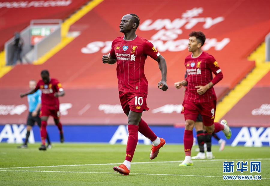 7月5日,利物浦队球员马内(前)在进球后庆祝。 当日,在2019-2020赛季英格兰足球超级联赛第33轮比赛中,利物浦队主场以2比0战胜阿斯顿维拉队。 新华社发
