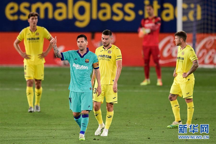 7月5日,巴塞罗那队球员梅西(左二)进球后庆祝,但随后这粒进球因越位在先被判无效。 当日,在2019-2020赛季西班牙足球甲级联赛第34轮比赛中,巴塞罗那队客场以4比1战胜比利亚雷亚尔队。 新华社/法新