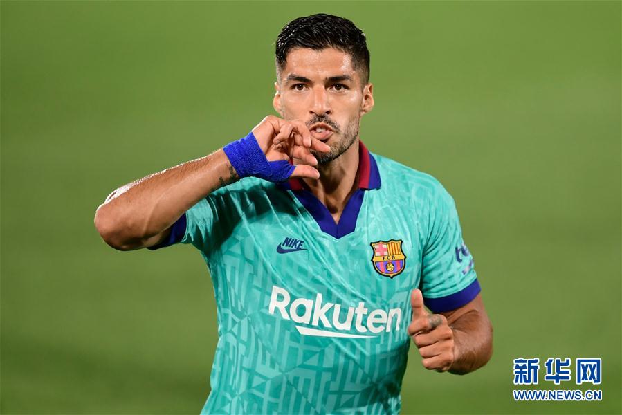 7月5日,巴塞罗那队球员苏亚雷斯进球后庆祝。 当日,在2019-2020赛季西班牙足球甲级联赛第34轮比赛中,巴塞罗那队客场以4比1战胜比利亚雷亚尔队。 新华社/法新