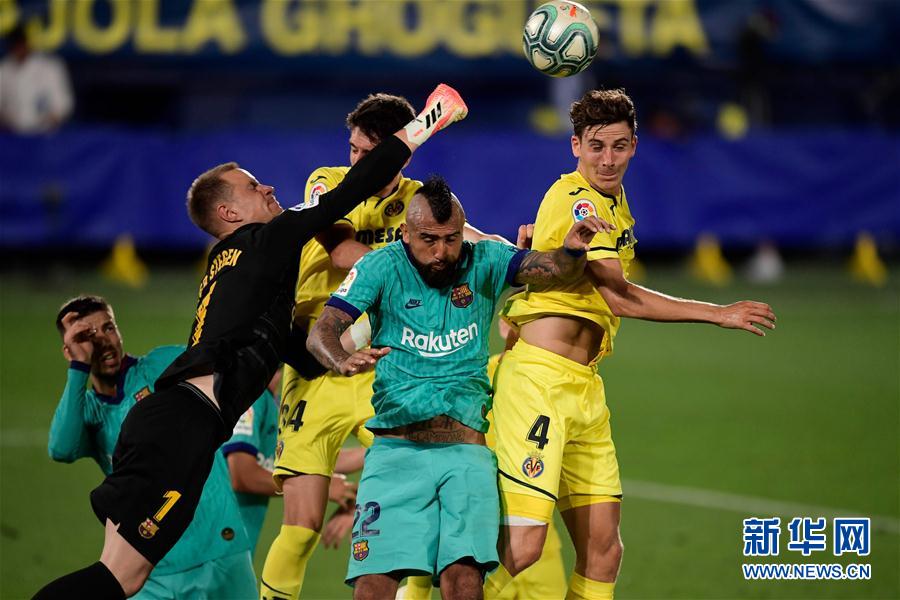7月5日,巴塞罗那队门将特尔施特根(左二)门前救险。 当日,在2019-2020赛季西班牙足球甲级联赛第34轮比赛中,巴塞罗那队客场以4比1战胜比利亚雷亚尔队。 新华社/法新