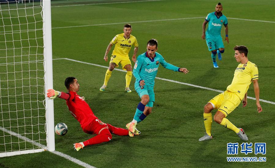 7月5日,比利亚雷亚尔队球员托雷斯(右一)打入一粒乌龙球。 当日,在2019-2020赛季西班牙足球甲级联赛第34轮比赛中,巴塞罗那队客场以4比1战胜比利亚雷亚尔队。 新华社/路透