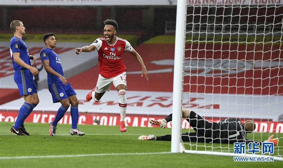 7月7日,阿森纳队球员奥巴梅扬(左三)在比赛中庆祝进球。 当日,在2019-2020赛季英格兰足球超级联赛第34轮比赛中,阿森纳队主场以1比1战平莱斯特城队。 新华社/美联