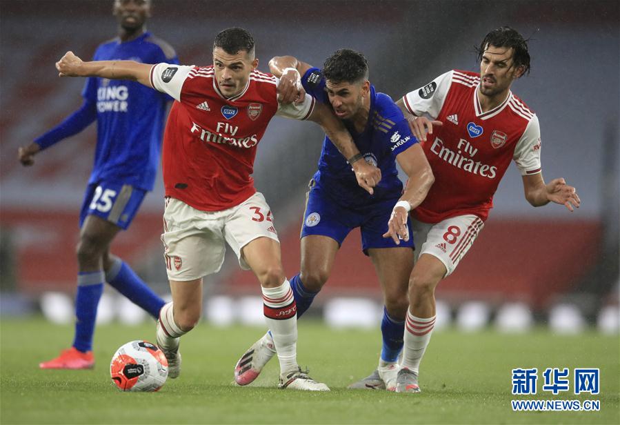 7月7日,莱斯特城队球员佩雷斯(右二)与阿森纳队球员扎卡(左二)拼抢。 当日,在2019-2020赛季英格兰足球超级联赛第34轮比赛中,阿森纳队主场以1比1战平莱斯特城队。 新华社/美联