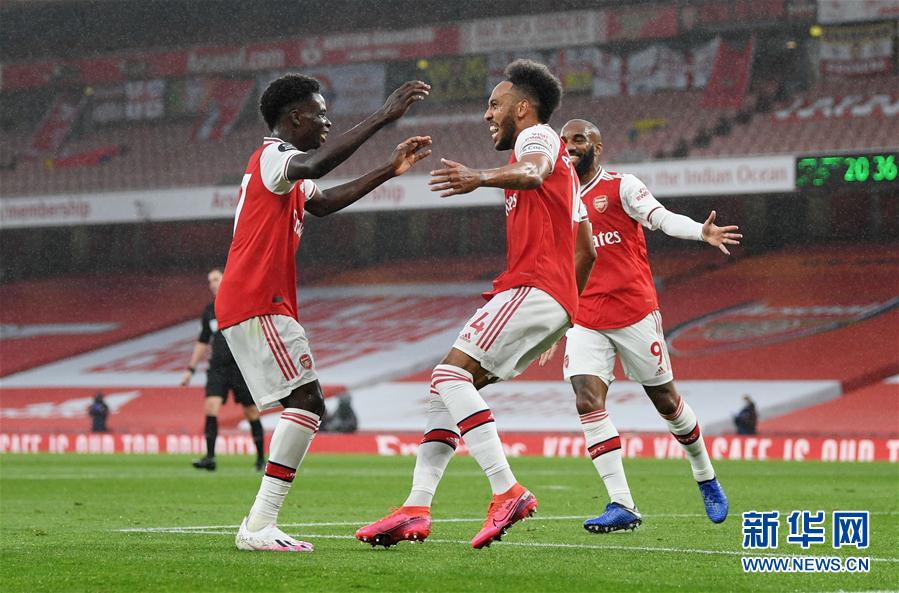 7月7日,阿森纳队球员奥巴梅扬(中)进球后与队友庆祝。 当日,在2019-2020赛季英格兰足球超级联赛第34轮比赛中,阿森纳队主场以1比1战平莱斯特城队。 新华社/路透