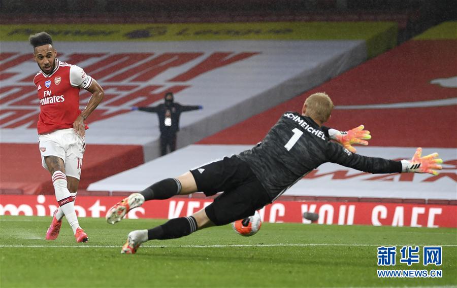 7月7日,阿森纳队球员奥巴梅扬(左)在比赛中攻入一球。 当日,在2019-2020赛季英格兰足球超级联赛第34轮比赛中,阿森纳队主场以1比1战平莱斯特城队。 新华社/美联