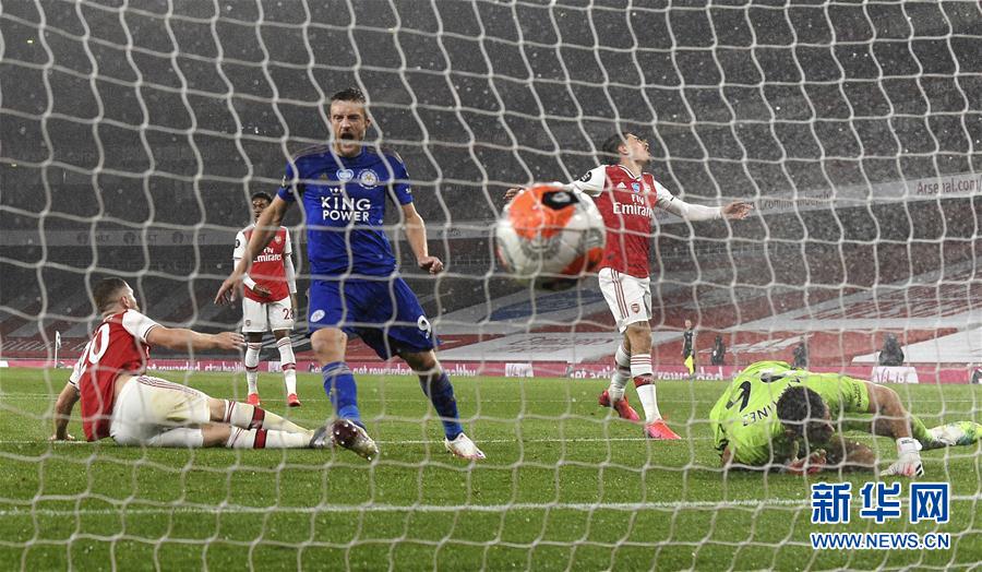 7月7日,莱斯特城队球员瓦尔迪(左三)在比赛中攻入一球。 当日,在2019-2020赛季英格兰足球超级联赛第34轮比赛中,阿森纳队主场以1比1战平莱斯特城队。 新华社/美联